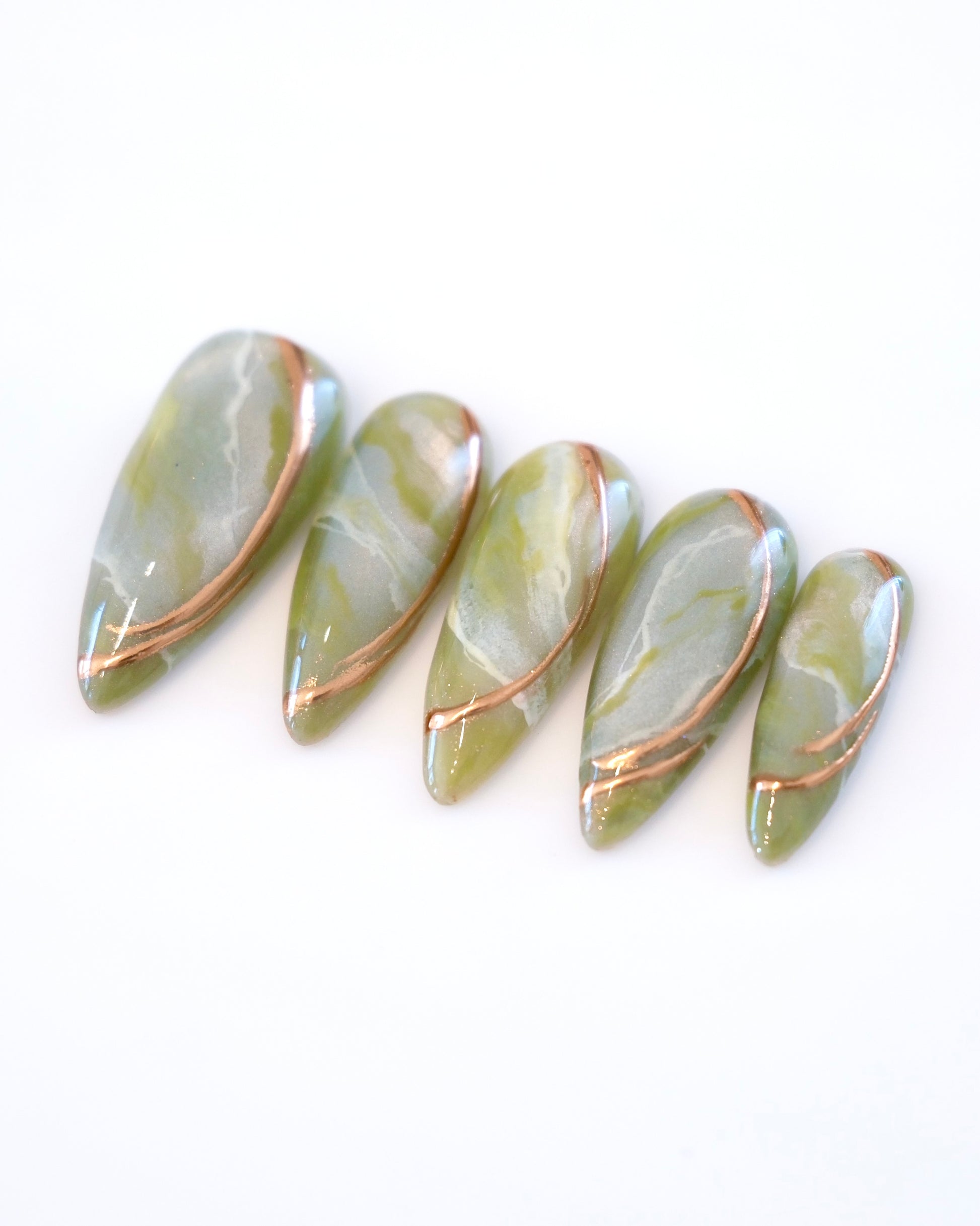 Bold, modern, and effortlessly luxe—Jaded brings the timeless beauty of jade stone to your fingertips. Featuring swirling shades of green with natural marbling and metallic copper accents, this set captures the elegance of polished gemstone with a fashion-forward edge.